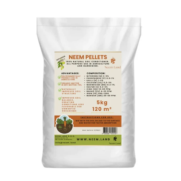 Organsko gnojivo neem peleti dobiva se preradom sjemena neem drveta. Koristi se za poboljšanje plodnosti tla i stabilnu opskrbu biljaka hranjivima. Istovremeno doprinosi ravnoteži u tlu i razvoju snažnog korijenskog sustava.